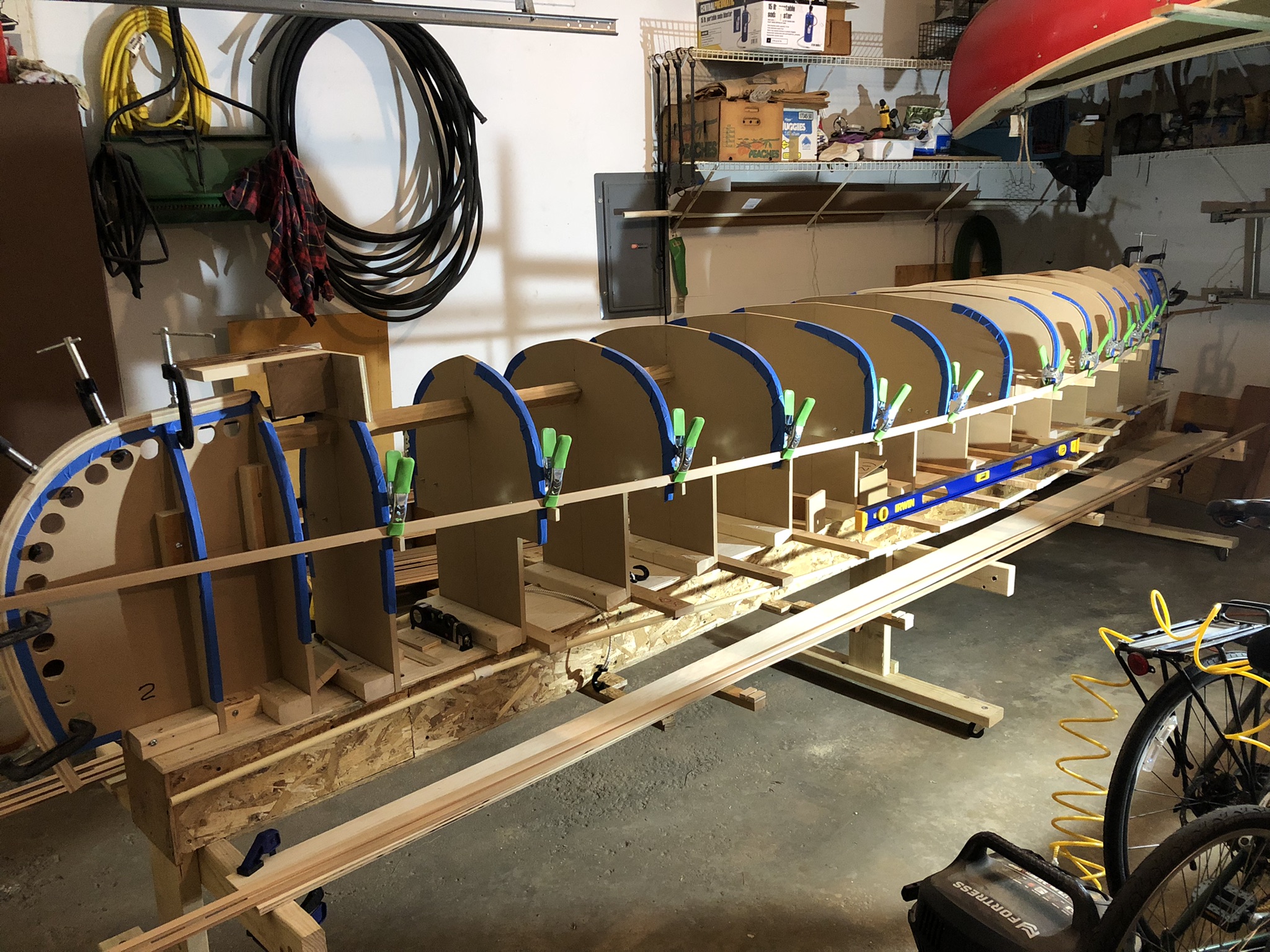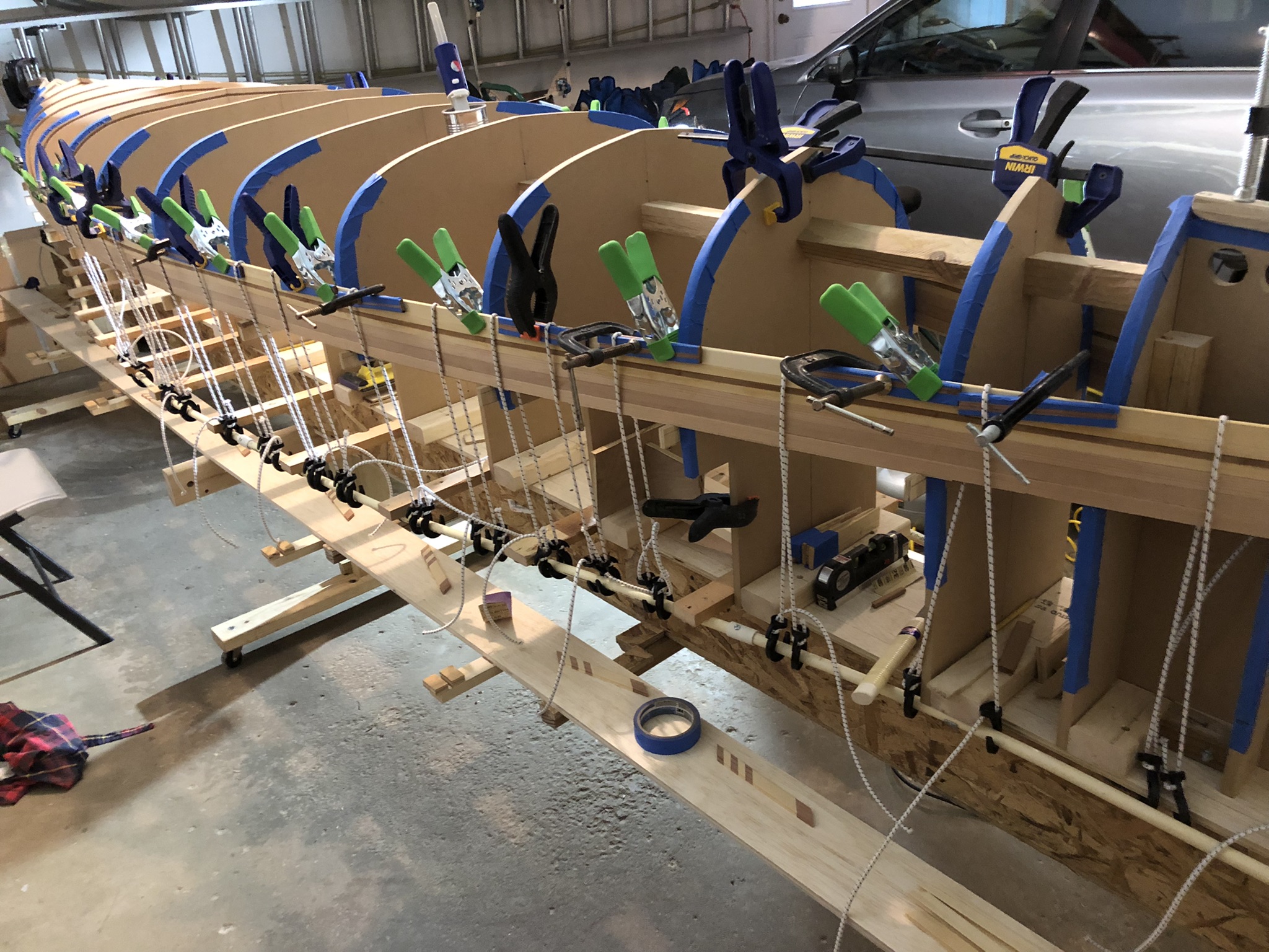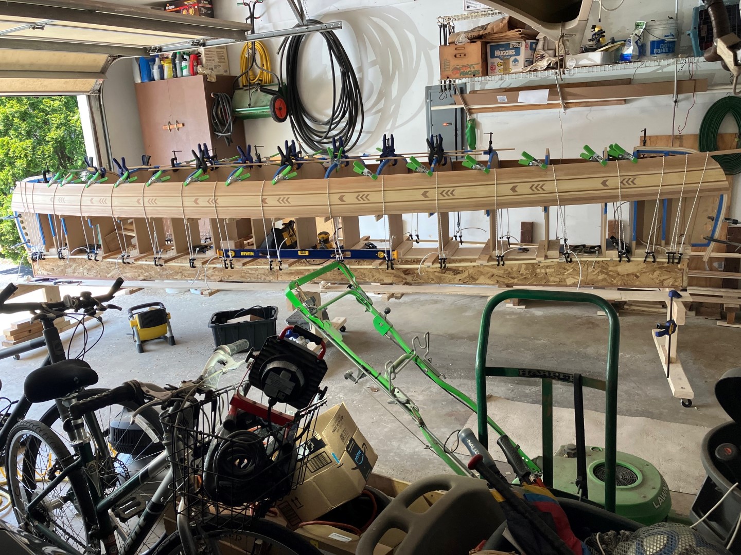 Outriggers, adjacent to the platform hold the next strip upside down so that glue can be applied in the groove with the glue gun.