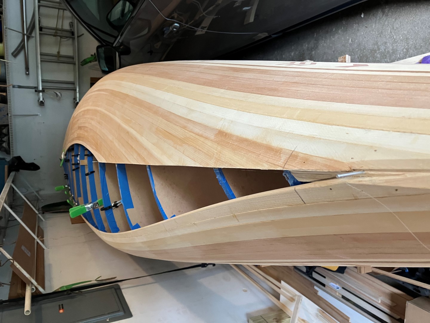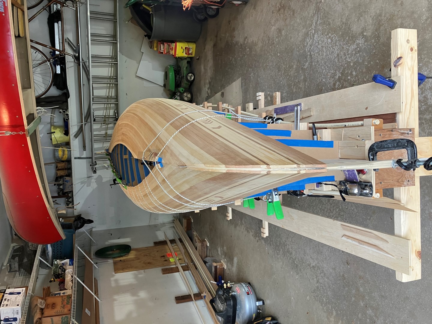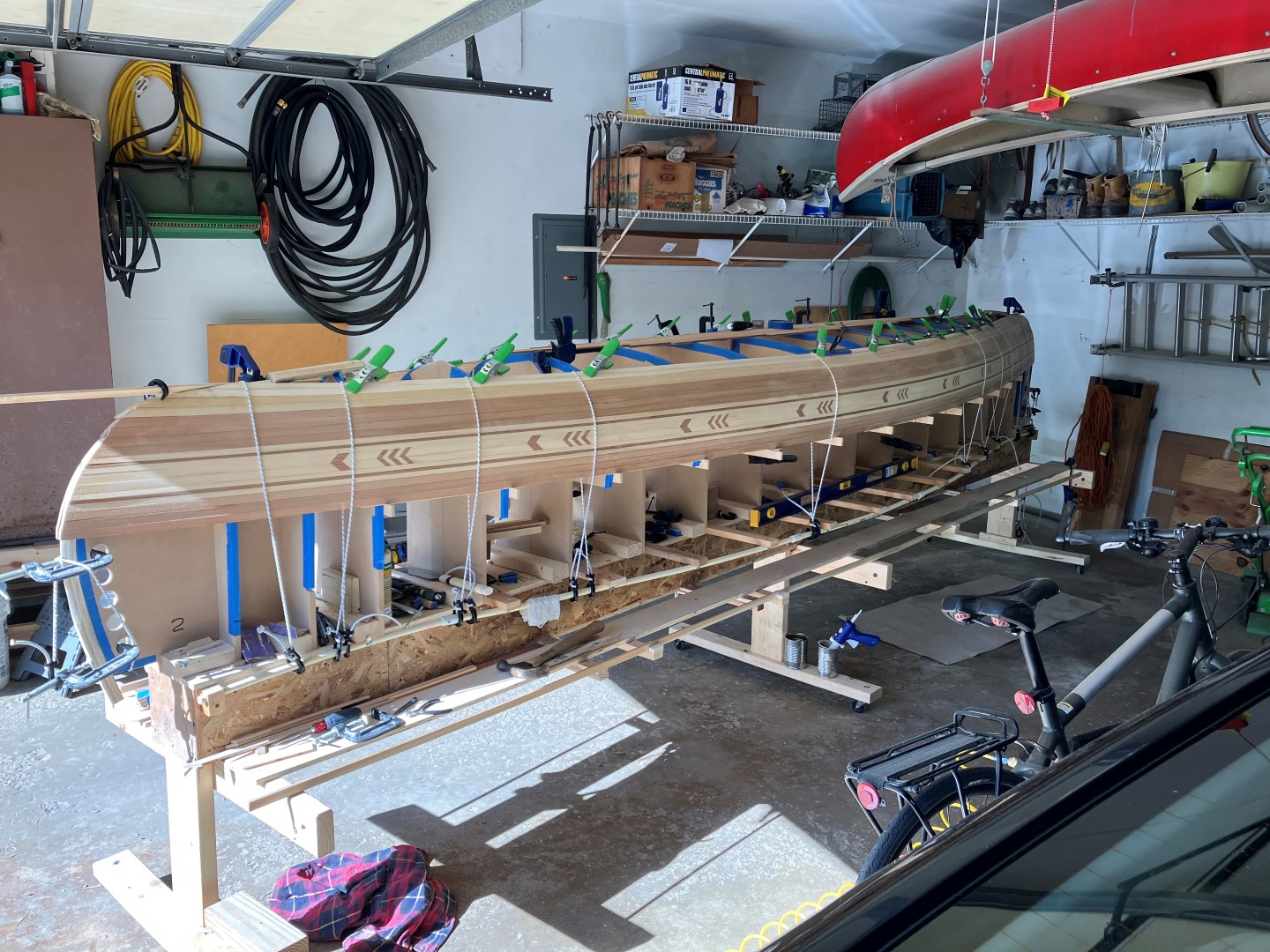 Outriggers, adjacent to the platform hold the next strip upside down so that glue can be applied in the groove with the glue gun.