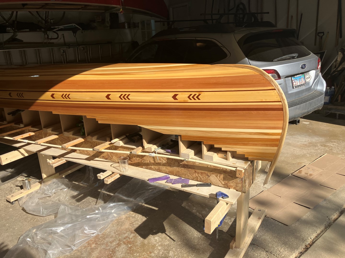 Wet out begins in the center of the boat and epoxy is worked out down the sides and toward the ends.