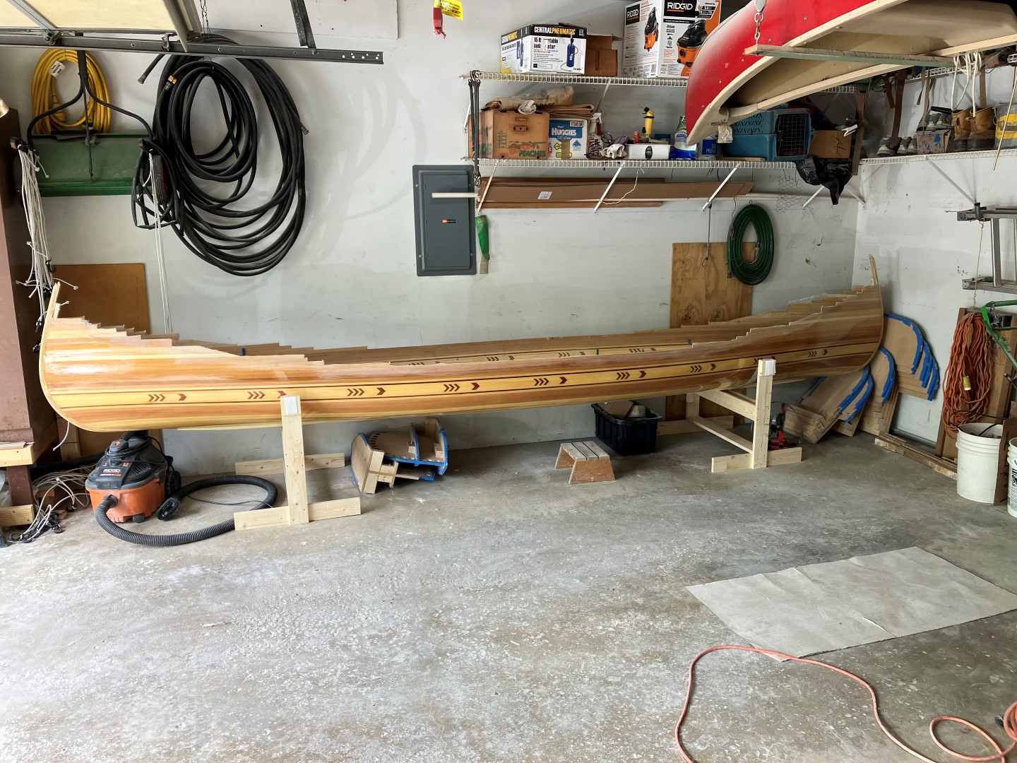With the exterior glasswork complete, the canoe was removed from the frame and interior sanded.