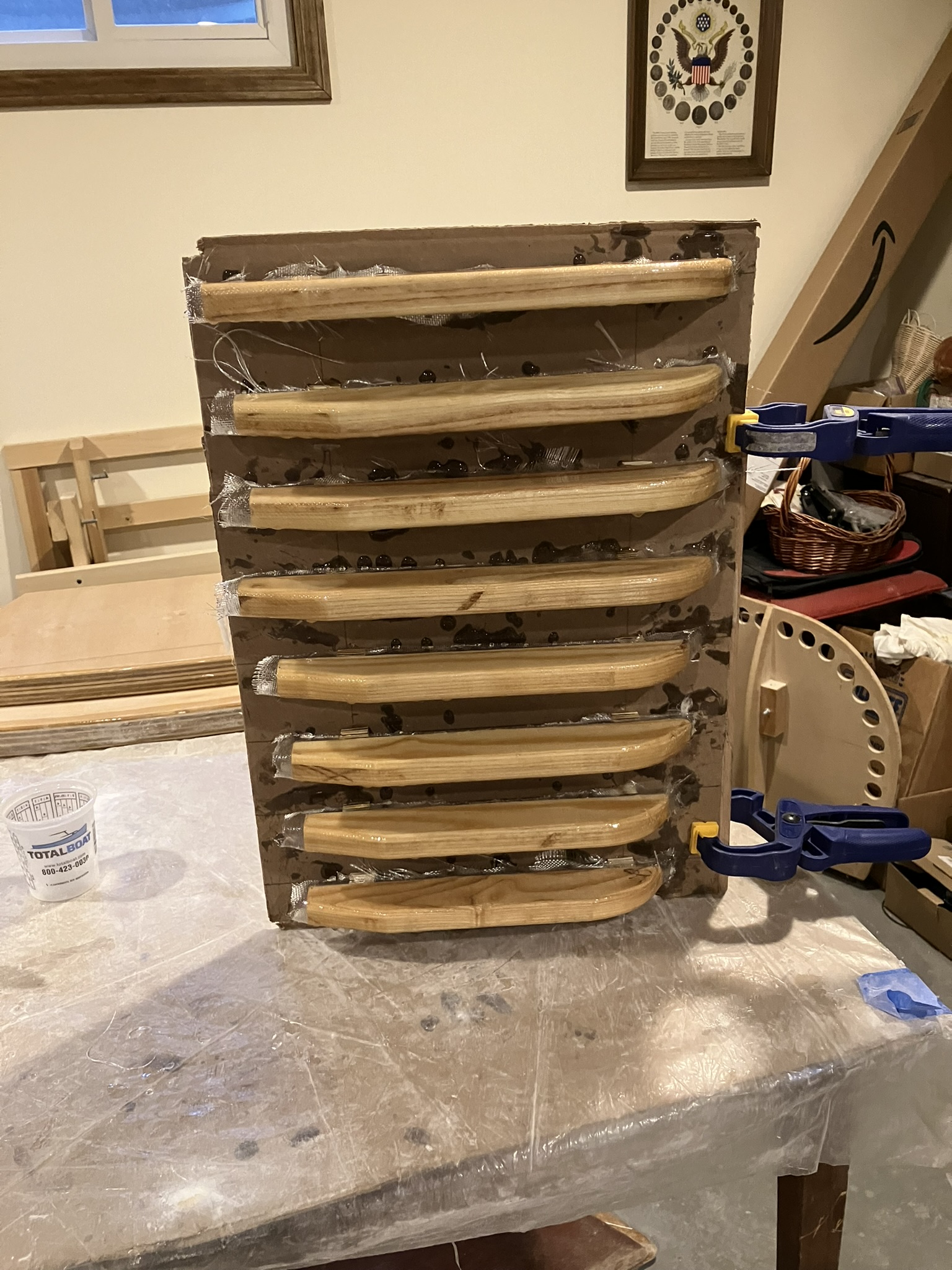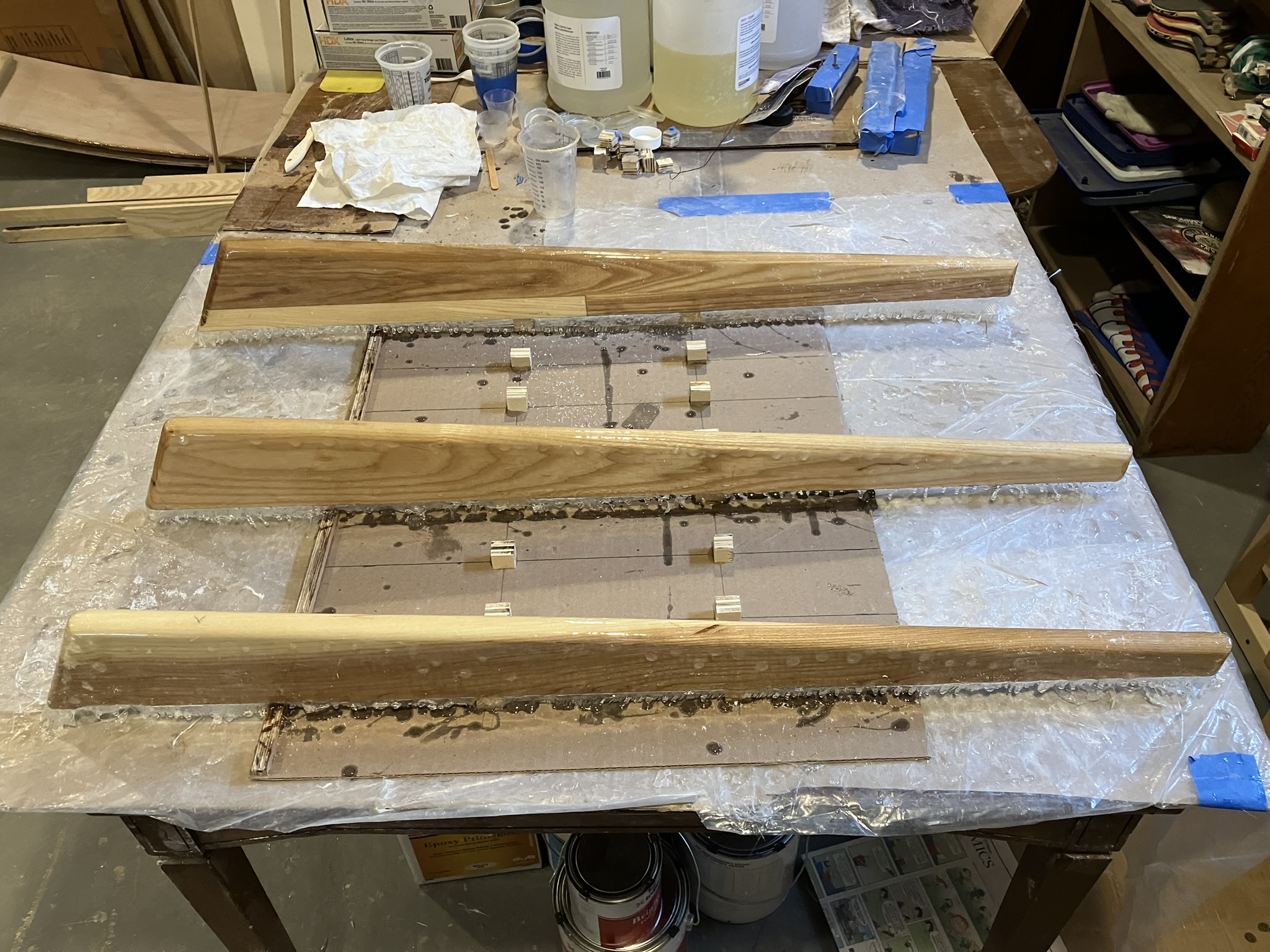 Ribs then mounted to spacers on a cardboard backing and layed-up in glass and epoxy.