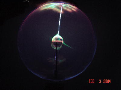 Plasma GlobeThe globe is 12 inches in diameter with a glass electrode up the middle. The glass electrode has a conductive paint on the inside diameter(not in contact with the noble gas) We obtained a few of these from a junk dealer who believed they were used in an old Frankenstein movie. The seals were broken requiring much effort to repair the glass, clean the globe, fill with gas, and re-seal. We placed brass wool into the electrode and then inserted our HV wire through the electrode throat and into contact with the brass wool. |