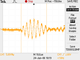 Theses waveforms provide a finer look at the SISG operation. First notch is clearly around 40 us after firing. Second notch around 80 to 90 uS. Full decay is predicted ot be at aboput 180 uS, but the waveforms are not clear enough to confirm it. Cycle period is 5.6 uS which corresponds to a resonant frequency of 178 kHz. |